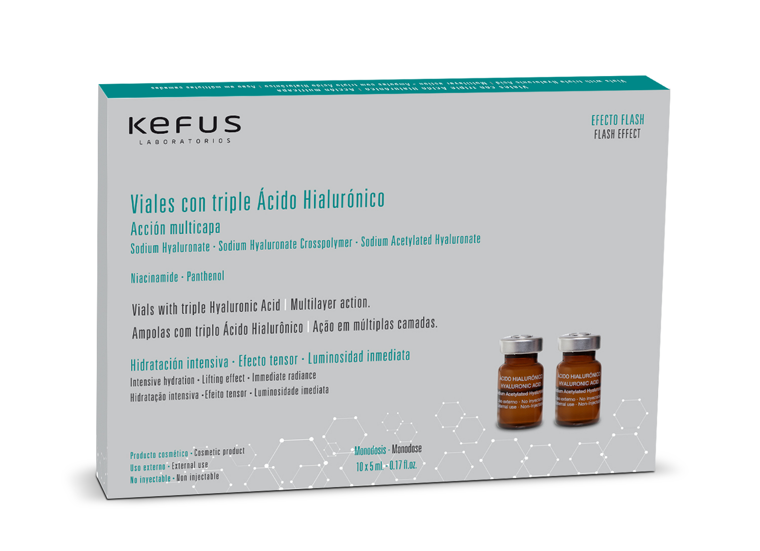 Testado dermatológicamente. Producto cosmético. No inyectable. Contenido 10 viales x 5 ml